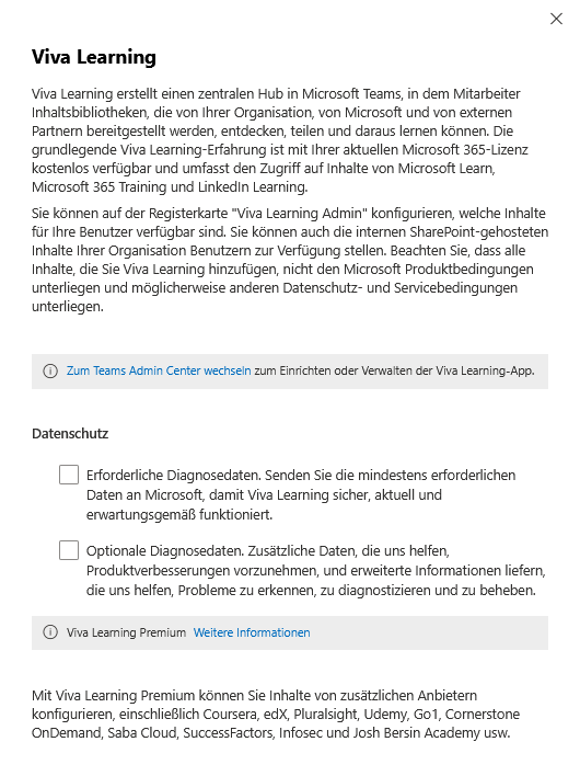 | Viva Learning | Datenschutz- und Einstellungen für die Integration externer Lerninhalte in Viva Learning |