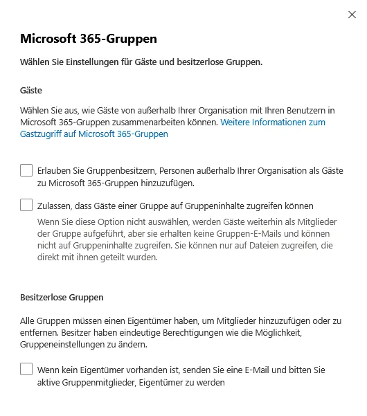 | Manage Guest Access in Microsoft 365 Groups | Vorgehen und Einstellungen zum Verwalten des Gastzugriffs in Microsoft 365-Gruppen |
