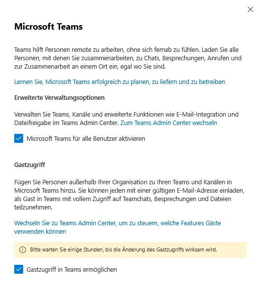 | Teams Admin Center | Konfiguration und Verwaltung von Teams inkl. Datenschutz und Gastzugriff |