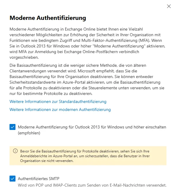 | Modern Authentication | Informationen zur Aktivierung und Verwaltung der modernen Authentifizierung in M365 |
